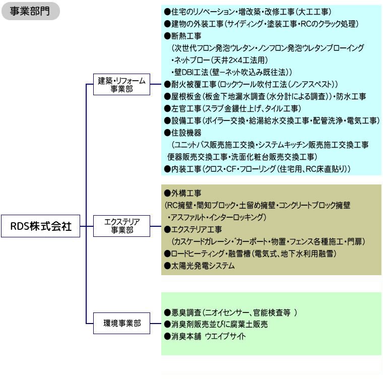 | 事業内容 | 新築・リフォーム・土木外構工事事業部・環境事業部(悪臭調査・消臭実施工) |