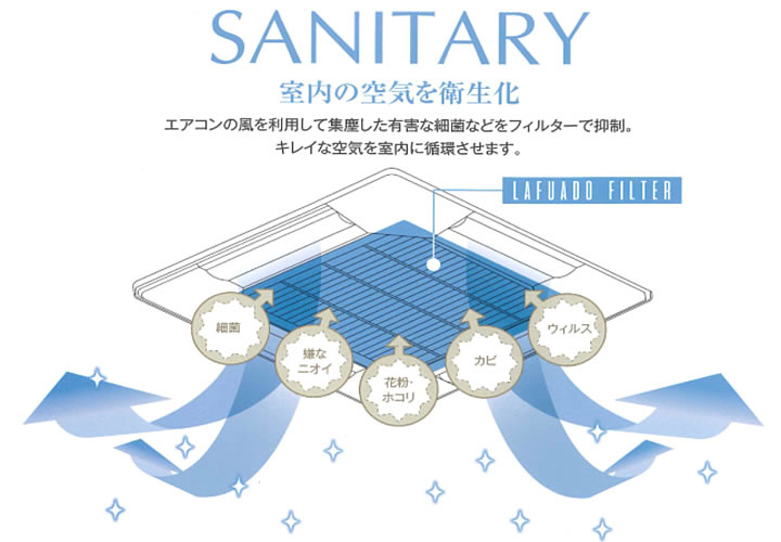 そのゴミ並び塵等には細菌、バクテリア、ウイルスが付着していることが多いまた、カビ菌は空気中を飛び廻っている為、冷暖房を止める時間の経過と共に結露が生じ、カビ菌の温床となることが多いのでエアコンの循環気流でも感染予防が可能になる。