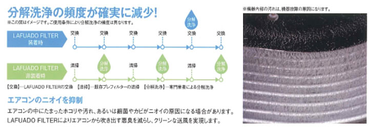 既存のエアコンの熱交換器の清浄度検査は年/1回は必要で高圧洗浄での洗浄除菌作業は必須です。そこで、フィルターにラーフエイド触媒を施し抗菌、消臭効果をもたらすフィルターを作りました。