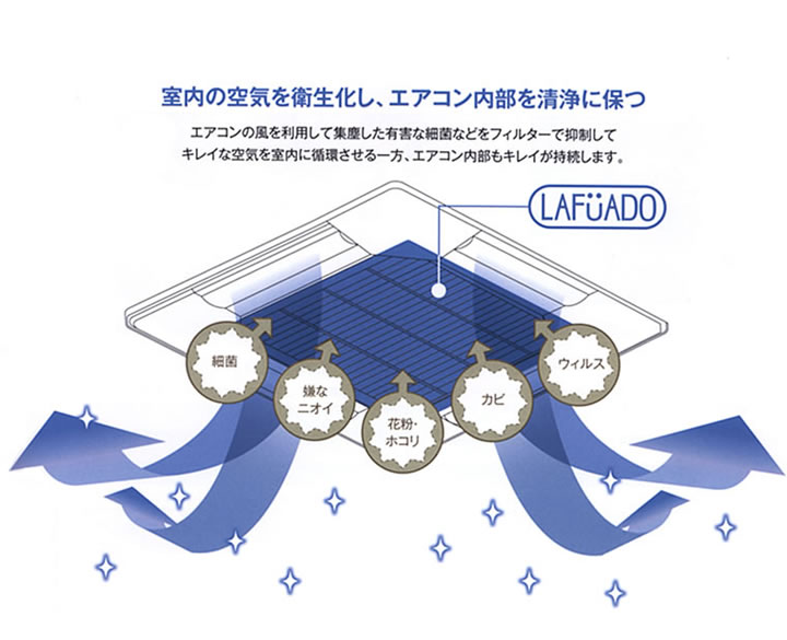 部屋の隅々まで冷暖房を届く様に設計されております、逆を言えば隅々にあるチリやゴミ等を吸引する能力があります。本来、ウイルスや細菌は自飛することは不可で、チリやゴミに付着して空気中を漂う事があるからです。ラーフエイドフィルターはラーフエイド液を特殊技術で含侵させたもので、特定のウイルスの数の減少、細菌の増殖を抑制致します。