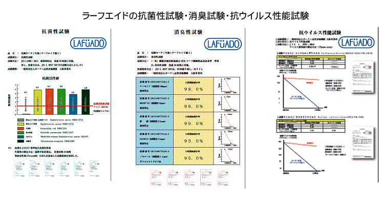 鉄イオン触媒ラーフエイドの優れた抗菌性、抗ウイルス性、消臭性試験です。